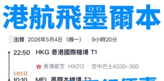【港航.澳洲2人同行抵價】香港飛墨爾本來回連稅$3,599起!包23kg寄艙行李+7kg手提行李!明年3至6月出發|香港航空