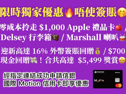 【獨家優惠!獎賞高達$5,499】唔使簽賬!零成本拎走$1,000 Apple 禮品卡!計埋回贈買 iPhone 可慳 $1,700|另可揀 Delsey 行李箱 / Marshall 藍牙喇叭|信銀國際 Motion 信用卡迎新優惠|Big Fun Trip x MoneyHero