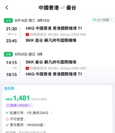 【阿聯酋航空.曼谷筍價】坐A380!香港飛曼谷來回連稅$1,481起!包25kg寄艙行李