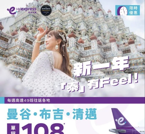 【HK Express 泰國限時優惠】香港飛曼谷 / 布吉 / 清邁$108起!1月至7月出發 (優惠至1月6日)