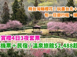 飛台灣睇櫻花!玩盡台北+宜蘭!武陵賞櫻4日3夜半自由行套票:華航機票+民宿 / 溫泉旅館+櫻花行程+接送$2,488起!早去晚返!季節限定!2018年2月出發 –...