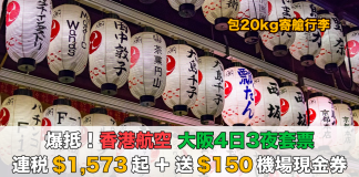 大阪套票癲減!香港航空.大阪「機票+酒店」連稅:4日3夜$1,573起、7日6夜$1,812起!再送$150機場現金券!