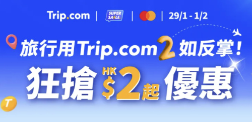 【狂搶$2優惠 Mega Sale】機票連稅一口價$222起;酒店連稅一口價$222起;高達$9,600機票及酒店優惠碼;高達$7,200高鐵優惠碼;預訂機票 / 酒店 / 高鐵享高達17%回贈;玩樂及門票買一送一 / 半價|Trip.com