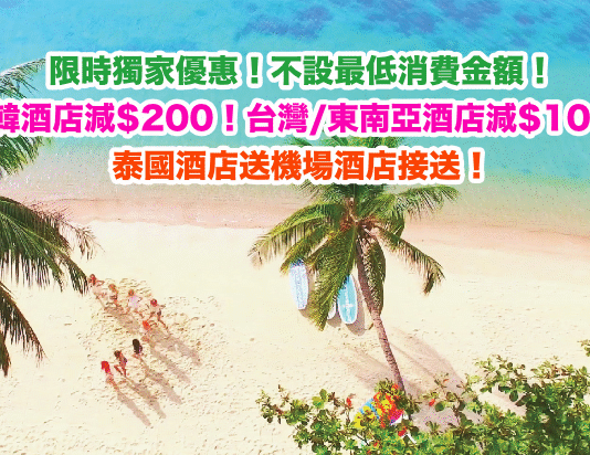 【號外.酒店優惠代碼】限時獨家優惠!不設最低消費金額!日韓酒店每單減$200!台灣/東南亞酒店每單減$100!泰國酒店送機場酒店接送!