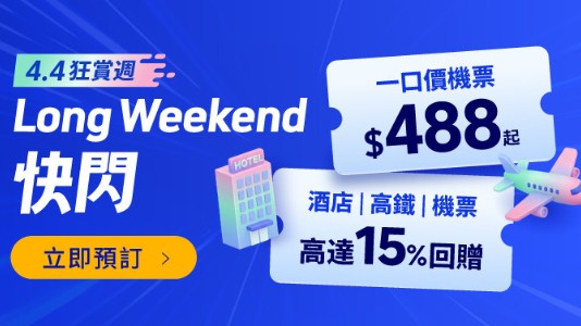 【4.4狂賞Mega Sale】機票連稅一口價$488!機票 / 酒店$400優惠券!高鐵買一送一;送高達$5,000優惠券碼!預訂機票 / 酒店 / 高鐵15%回贈!玩樂及門票買一送一 / 半價!精選旅行團3折起|Trip.com