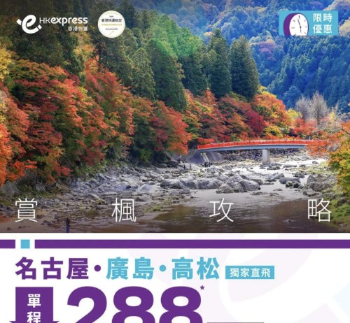 【HK Express 日本紅葉限時優惠】香港飛名古屋 / 廣島 / 高松$288起!10月至明年3月出發 (優惠至10月14日)