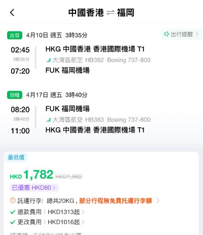 【灣空.福岡last minute優惠】香港飛福岡來回連稅$1,782起!包行李+隨身物品+輕食!
