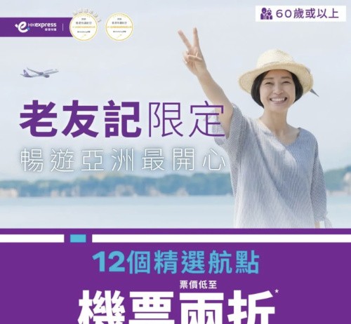 【HK Express|60+老友記專享優惠 】台北$22、首爾$60、名古屋 / 廣島$102!12個精選航點機票2折!暑假旺季都有折!10月24日前出發 (優惠至4月20日)