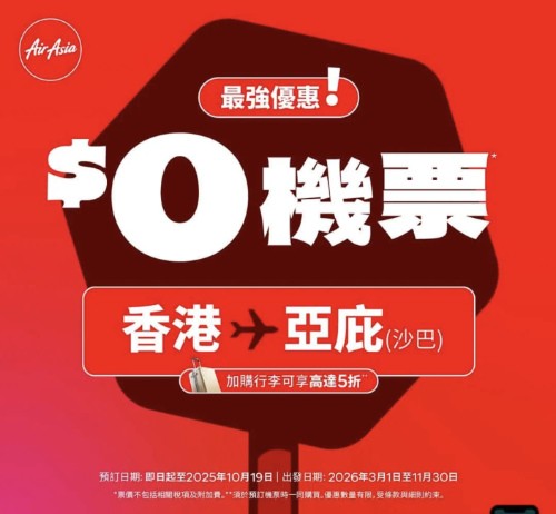 【AirAsia $0】沙巴$0起、曼谷$20起、沖繩$233起!來回連稅九百起!2026年11月30日前出發 (優惠至10月19日)