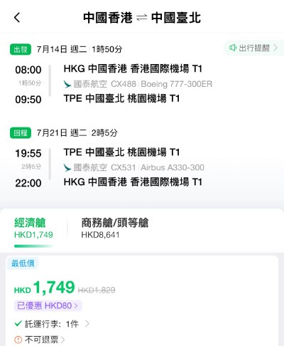 【國泰.暑假飛台北】香港飛台北來回連稅$1,749起!包23kg寄艙行李!7至8月暑假旺季出發