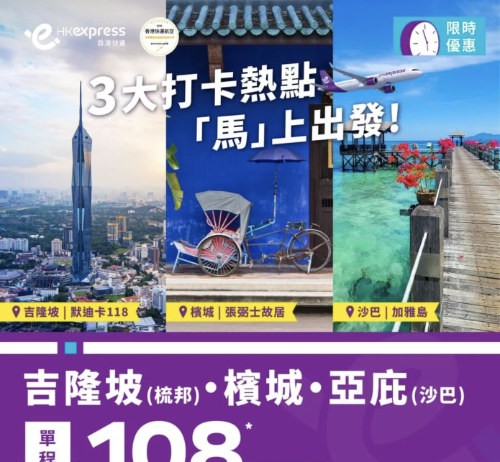 【HK Express 馬來西亞限時優惠】香港飛檳城 / 亞庇 / 吉隆坡$108起!1月至7月出發 (優惠至1月8日)