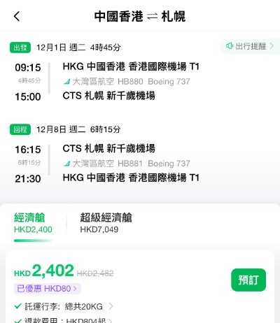 【灣空.北海道抵價】香港飛札幌來回連稅$2,402起!包寄艙行李+手提行李+隨身物品+輕食!9至12月出發