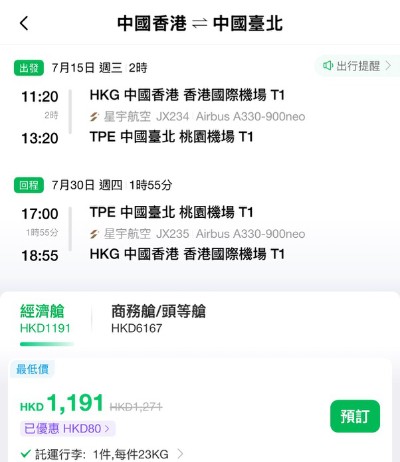 【星宇.台北再劈】暑假都減!香港飛台北來回連稅$1,191起!可早去晚返!包寄艙+手提+飛機餐!機票有效期長達12個月