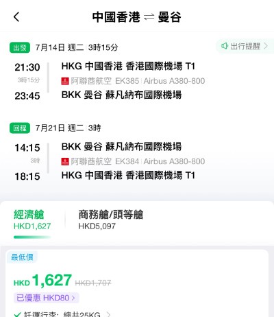 【暑假抵飛曼谷】阿聯酋航空A380.香港飛曼谷來回連稅$1,627起!包25kg寄艙行李