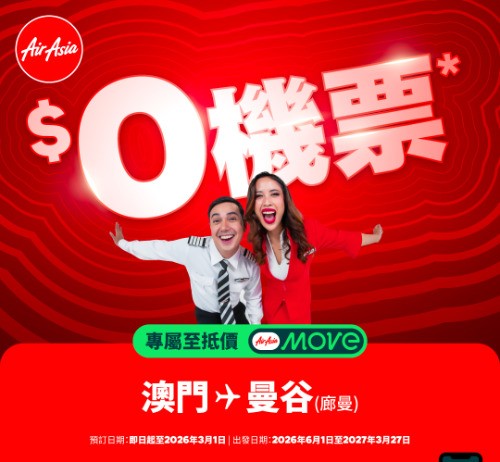 【AirAsia $0】BIG SALE!日本、泰國、馬來西亞、菲律賓低至99%OFF!香港出發低至2蚊!澳門出發低至0蚊!出發日期至2027年3月27日 (優惠至3月1日)