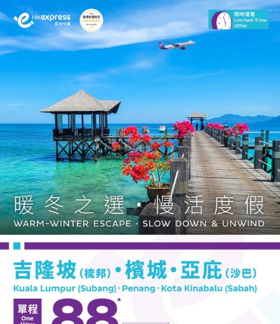 【HK Express 馬來西亞限時優惠】香港飛檳城 / 亞庇 / 吉隆坡 $88起!12月至明年6月出發 (優惠至11月27日)