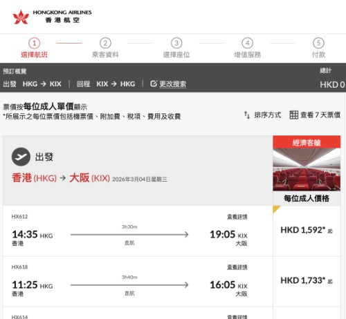 【港航.大阪閃減】香港飛大阪來回連稅$1,592起!包寄艙行李+手提行李+隨身物品!3至6月出發