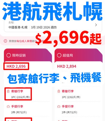 【港航.北海道再減多啲】香港來回札幌連稅$2,696起!包23kg寄艙行李+7kg手提行李+飛機餐!早機去、下午機返!3月28日前出發|香港航空