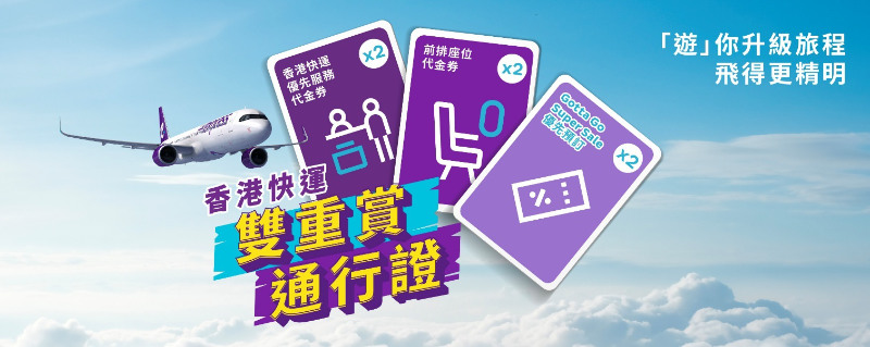 有咗「雙重賞通行證」,可以喺一年內獲享兩次指定 Gotta Go Super Sale 優先搶購超值機票嘅機會,同時再送你「香港快運 優先服務+」及「前排座位」服務各兩次!即係話… 由訂票、登機到落機,全程都可快人一步!