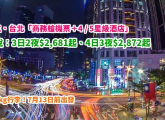 平價筍歎!港航.台北「商務艙機票+4 / 5星級酒店」連稅:3日2夜$2,681起、4日3夜$2,872起!包30kg行李!7月13日前出發 – 香港航空 (優惠至4月30日)
