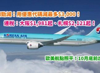 大韓勁減!用優惠代碼減最多$3,000!連稅:大阪$1,981起、札幌$2,121起!歐美航點照平!10月底前出發 – 大韓航空 (優惠至4月22日)