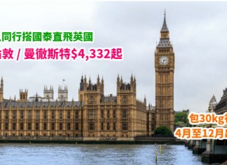 2人同行優惠!搭國泰直飛英國!香港來回倫敦 / 曼徹斯特$4,332起!4月至12月出發 – 國泰航空 (優惠至4月30日)