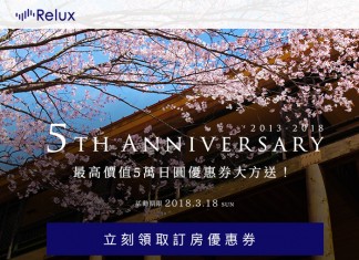 筍到噴飯!Relux 5周年送大禮!送出最高價值55,555日圓優惠券!爽訂日本最高級酒店!8月31日前入住 – Relux (活動至3月18日)
