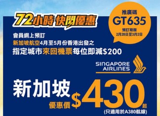 想平坐新航嘅全新 A380機艙?機會嚟喇!隔咗一排,新加坡航空終於推出限時4日新優惠! 香港來回新加坡只需$630起 (連稅$1,085起)、悉尼$2,000起 (連稅$3,076起)、倫敦$3,260起 (連稅$4,931起)! 價錢都幾爆抵!搶得過!加上新航最近翻新咗旗下嘅 A380機隊,大家可以坐全新機艙啦!連飛新加坡都有得坐 A380㗎!新航嘅服務向來優質,坐埋全新 A380更加無得頂! 想飛得再舒服啲?可以考慮升級至優選經濟艙 / 商務艙 / 新航套房,直情好似住緊酒店咁! 經濟客艙客每人有30kg寄艙行李,盡情 shopping 都唔怕爆喼啦! 預訂資訊: 出發日期: 2018年4月8日-4月26日、4月29日-5月28日、5月31日 (適用航班SQ861/SQ856) 2018年5月1日-5月31日 機票有效期: 2-5日、 3-21日 預訂日期:即日-2018年3月2日 預訂網址:http://www.singaporeair.com/zh_TW/hk