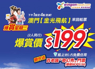 抵到你唔信!閃劈3粒鐘!金光飛航.香港來回澳門船票$199!再送百老匯「奇幻秀」門劵 (價值$150)+船上免費任用 WiFi – 永安旅遊 (優惠至2月28日4:00pm)
