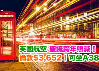 聖誕跨年照減!香港直航來回倫敦$3,652!可坐A380!2018年5月31日前出發 – 英國航空 (優惠至11月27日)