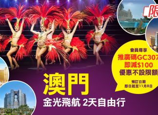 又有超筍嘅澳門套票介紹俾大家!永安旅遊推出「澳門金光飛航2日1夜套票」優惠,輸入推廣碼「GC307」後每位可減$100,即每位$599起!價錢已包5星級酒店住宿、金光飛航香港來回澳門氹仔船飛,仲送埋《百老匯奇幻秀》B區門票、「吃到飽」套餐券!抵呀! 用咗推廣碼後: 澳門新濠影匯酒店 Studio City 2天套票 (酒店+船飛)|每人$599起 澳門喜來登金沙城中心大酒店2天套票 (酒店+船飛)|每人$691起 澳門JW萬豪酒店2天套票 (酒店+船飛)|每人$797起 澳門銀河酒店2天套票 (酒店+船飛)|每人$882起 以上價格係以2人同行每位計,包晒所有稅項及附加費。 來回兩程船飛都可以自選上環或尖沙咀上落,想豪小小搭頭等艙的話,每位加$88就可以了! 優惠碼只限永安會員登入網站或手機 App 後使用,大家上永安網站就可以免費成為會員!12月30日前出發都可享優惠,但要11月8日前預訂!優惠係限時不限量嘅,優惠期內訂到就每位即慳$100啦! 預訂資訊: 出發日期:即日-2017年12月30日 (部分日子不適用) 預訂日期:即日-2017年11月8日 減$100推廣碼:GC307 預訂網址:https://package.wingontravel.com/
