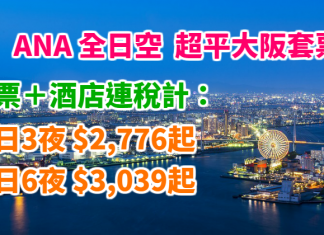 抵上抵!ANA 大阪超平套票!用滙豐卡再減$600!大阪「機票+酒店」連稅:4日3夜$2,776起、7日6夜$3,039起!2018年3月底前出發 – ANA全日空 (優惠至12月31日)