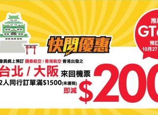 周末掃貨!國泰 / 港航2人同行.台北、大阪機票減$200!國泰飛台北$756起、大阪$2,115起 – 永安旅遊 (優惠至10月29日)