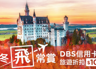 Hutchgo 同 DBS 推出咗秋冬優惠!DBS信用卡用戶訂全線機票、酒店可享$100折扣! 用DBS Eminent Card / DBS COMPASS VISA / DBS Black World Mastercard信用卡簽賬都有平!只要全單滿$1,500 (未連稅計),於付款時輸入優惠碼「DBS100」或「DBSB100」即減$100! 用咗優惠代碼後: 國泰航空.香港來回台北 (2人同行)|每位$769起 (連稅$1,153起) 出發日期:即日-2017年12月19日、12月29日-2018年2月11日、2月21日-3月25日 預訂日期:即日-2017年12月27日 寄艙行李限額:30kg 新加坡航空.香港來回新加坡 (2人同行)|每位$993起 (連稅$1,833起) 出發日期:即日-2017年12月19日、12月29日-2018年2月9日、2月22日-3月25日 預訂日期:即日-2017年11月6日 寄艙行李限額:30kg 香港航空.香港來回沖繩 (2人同行)|每位$1,248起 (連稅$1,572起) 出發日期:即日-2018年2月12日、2月19日-3月27日、4月2日-5月19日、9月16日-9月28日 預訂日期:即日-2017年11月6日 寄艙行李限額:20kg 美國航空.香港來回洛杉磯|$2,206起 (連稅$3,066起) 出發日期:2017年12月18日-12月27日、2018年1月9日-1月11日、1月15日-2月8日、2月19日-2月21日、2月26日-3月23日 預訂日期:即日-2017年10月31日 寄艙行李限額:2件23kg 國泰航空.香港來回墨爾本|$3,436起 (連稅$4,401起) 出發日期:即日-2017年12月31日、2018年1月4日-2月8日、2月20日-3月29日 預訂日期:即日-2017年10月31日 寄艙行李限額:30kg 國泰航空.香港來回溫哥華|$4,298起...