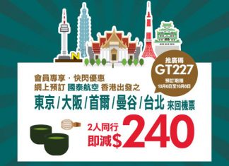 永安旅遊會係今晚12點 (10月6日0:00) 推出國泰飛台北 / 曼谷 / 首爾 / 東京 / 大阪機票2人同行優惠,付款前輸入推廣碼「GT227」,即減$240優惠,限時3日!