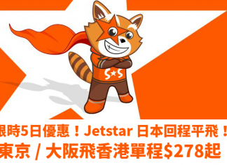 限時5日優惠!Jetstar 日本回程平飛!東京 / 大阪飛香港單程$278起!2018年2月前出發 – Jetstar (優惠至10月10日)