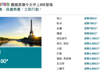 國泰/港龍 fanfares $590起!東京$2,390、巴黎$3,490、倫敦$3,990