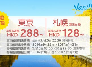 香草心動價!香港飛東京單程$288起!東京飛幌單程$416起!2017年1月31日前出發