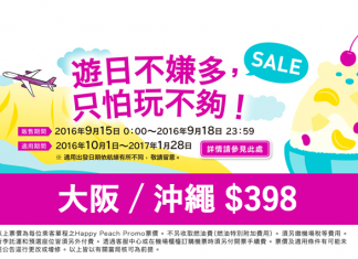 樂桃日本返港優惠!沖繩/大阪返港單程$327起!2017年1月底前出發