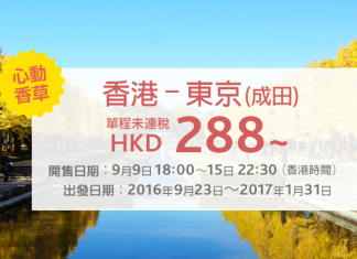 香港飛東京成田單程只需$288起,來回連稅$950起!價錢吸引!旅行日期由9月23日至2017年1月31日。當中9月23日至10月29日單程$354,來回連稅$1,082!