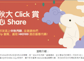 Ctrip 推出中秋送$100酒店優惠碼活動,現有會員只要喺2016年9月2日至9月15日期間,click「送出中秋月餅」連結,並分享俾朋友 (可多於3位),如成功邀請3位好友成為Ctrip 新用戶,咁就可以獲得HK$100酒店優惠碼,而您嘅好友亦可得到新用戶酒店優惠代碼。Ctrip 嘅澳門酒店一向比人平,愛嚟訂澳門或其他地方嘅酒店可以再抵啲。