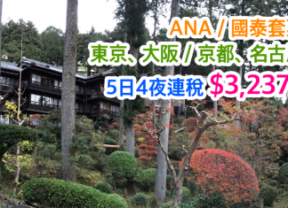 5日4夜套票連稅東京$3,492起、大阪/京都$3,237起、名古屋$3,616起!2017年1月18日前出發。