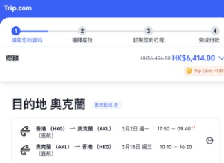 (於付款頁輸入98折優惠碼「TRAVELERHK26F」後:直飛奧克蘭連稅 $6,414起;經奧克蘭轉飛基督城 / 威靈頓 / 皇后鎮連稅 $6,355起)