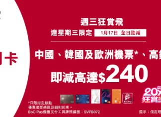 憑中銀 Visa / Mastercard 信用卡客戶於永安旅遊預訂中國、韓國及歐洲指定航點機票滿 $1,500 (未連稅),付款前輸入推廣碼【BOCT686】即減 $200!預訂高鐵車票滿 $500 用推廣碼【BOCJ351】即減 $40!