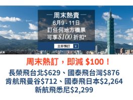 全線機票減$100!長榮飛台北$629、國泰飛台灣$876、肯航飛曼谷$712、國泰飛日本$2,264、新航飛悉尼$2,299 – Zuji (優惠至6月11日)