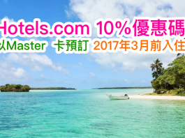Hotels.com 10%優惠碼!用Master card 預訂,額外有多9折!2017年3月31日前入住