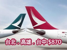 國泰台灣優惠!台北、高雄、台中$870!10月31日前出發 – 國泰/港龍航空