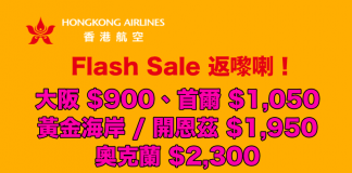 必搶!香港航空 Flash Sale!大阪$900、首爾$1,050、黃金海岸 / 開恩茲$1,950、奧克蘭$2,300 (優惠至8月2日)