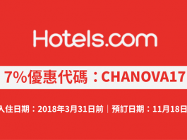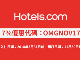 Hotels.com 7%優惠代碼!訂房可獲額外93折!不限旅遊地點.2018年3月31日前入住 (優惠至12月2日)