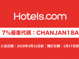 Hotels.com 7%優惠代碼!訂房可獲額外93折!不限旅遊地點.2018年3月31日前入住 (優惠至1月17日)